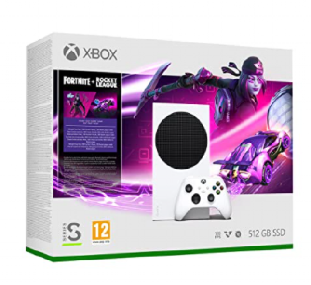 Holen Sie sich das Xbox Series S - Fortnite & Rocket League Bundle mit dem Midnight Drive Pack, 1.000 V-Bucks und 1.000 Rocket League Credits.