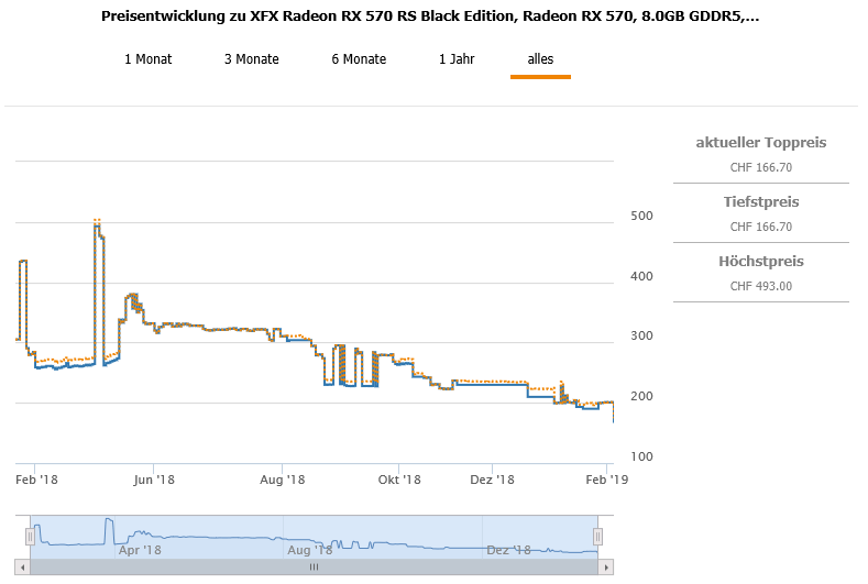 Bei reichelt gibt es aktuell die XFX Radeon RX 570 RS Black Edition, 8.0GB GDDR5 inkl. Versand für 174.50 CHF. Gemäss toppreise war der bestprice bislang bei 196.50 CHF, der zweitbeste Preis liegt aktuell bei 200.90 CHF.