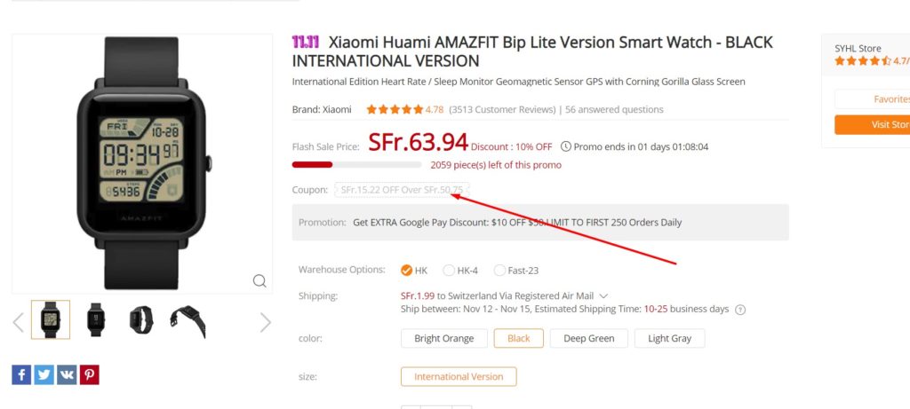 Bei Gearbest kann man sich gerade die Xiaomi Huami AMAZFIT Bip Lite Version Smart Watch für 51 Franken geiern, inkl. Lieferung in die Schweiz. Dazu einfach auf die Produkteseite klicken, anschliessend (man muss eingeloggt sein) unter dem Preis auf den Coupon klicken und diesen dem Benutzerkonto hinzufügen. Danach die Smartwatch dem Warenkorb hinzufügen, zur Kasse klicken, Lieferart „Registered Air Mail“ auswählen und ca. 4-6 Wochen später hat man die Smartwatch bei sich zu Hause. Aufgrund des Bestellwerts sogar zollfrei.
