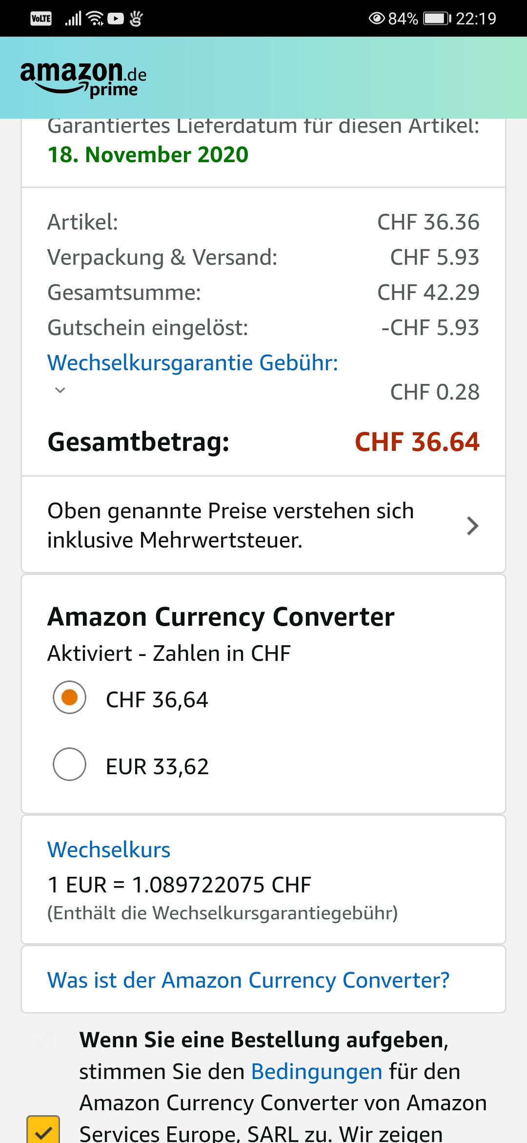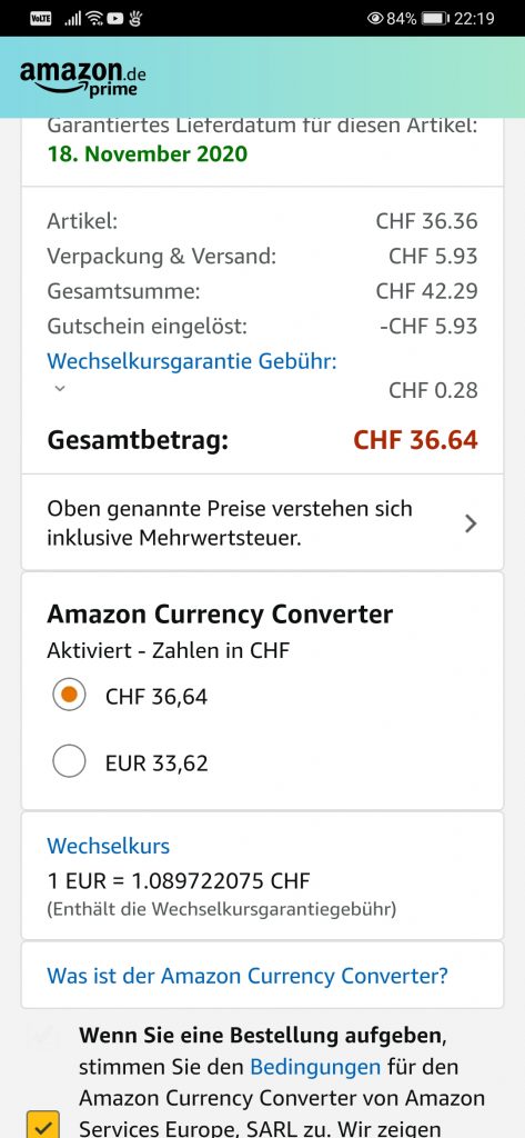 • Für Lieferungen in die Schweiz wird der Preis erst bei Angabe einer Schweizer Lieferadresse richtig angezeigt (Abzug der Mehrwertsteuer, zuzüglich Versandkosten) resp. beim Checkout an der Kasse (Amazon Frankreich, Italien, Spanien und Grossbritannien). Wir verwenden grundsätzlich den Interbanken-Kurs für die Umrechnung in CHF.