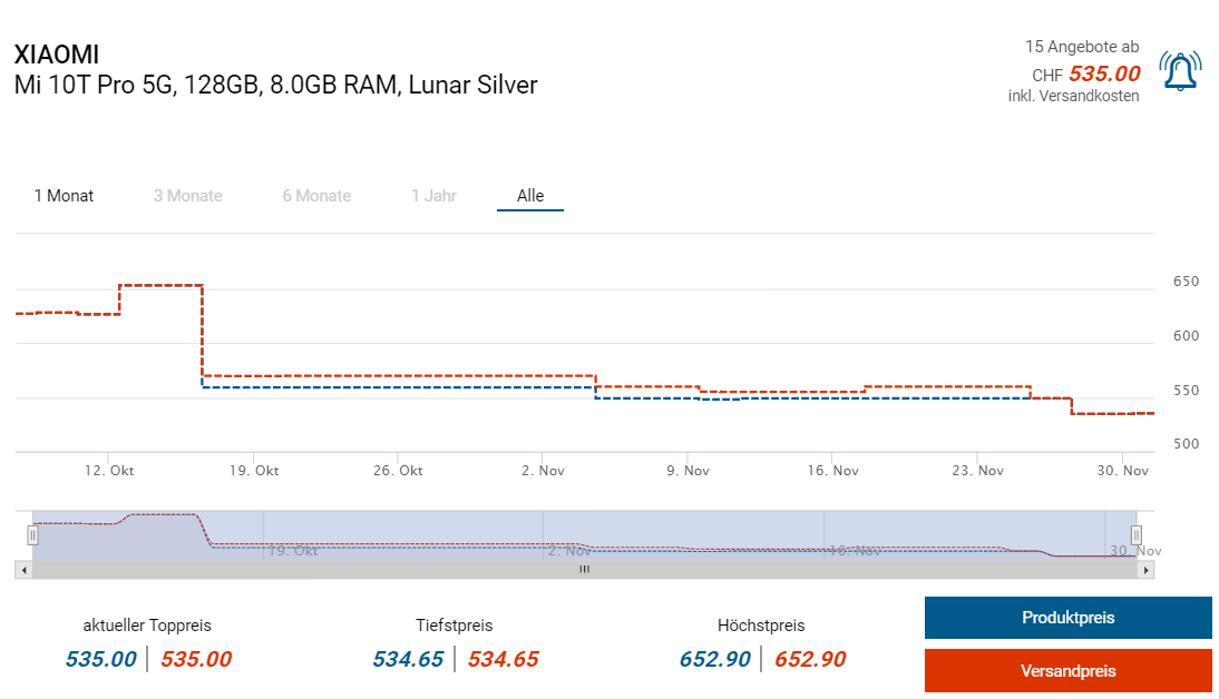Bei Amazon Italien gibts derzeit das Mi 10T Pro mit 8/128GB Speicher zum Aktionspreis von knapp 479 Franken. Laut toppreise liegt der zweittiefste Preis derzeit bei CHF 535.- für die silberne Variante.