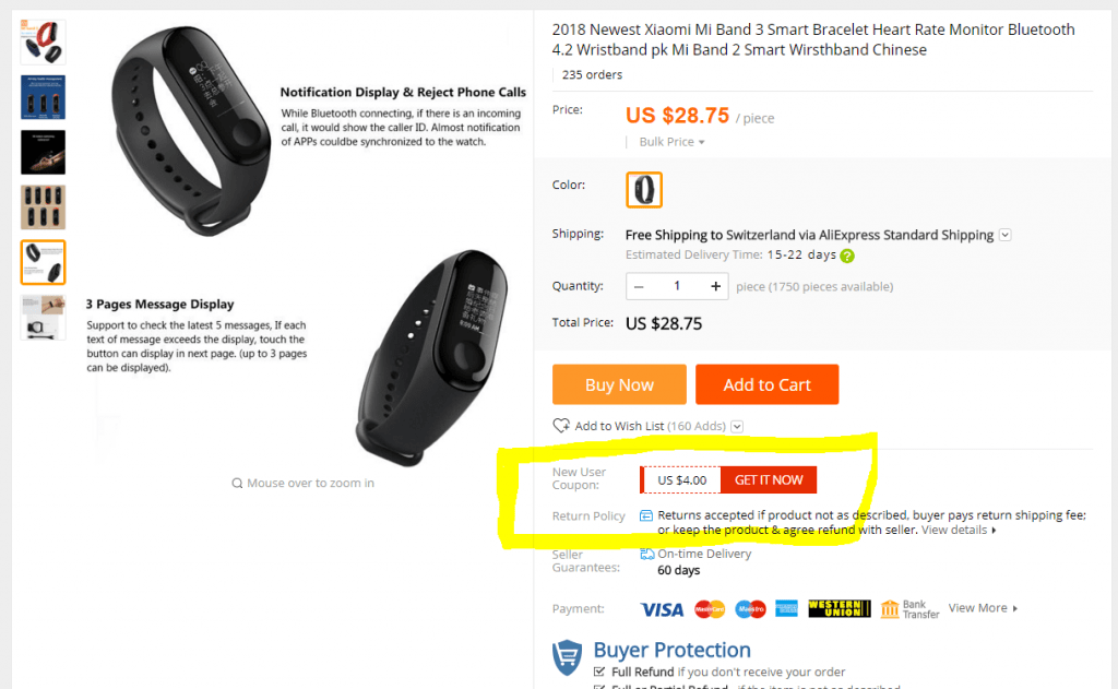 Wenn man sich bei AliExpress einen neuen Account erstellt, kann man das Xiaomi Mi Band 3 für unter CHF 25.- kaufen. Dazu einfach auf “Zum Deal” klicken und danach auf den Knopf “Get it now” im markierten Bereich.