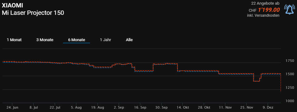 Normalpreis ist 1299 Franken, dafür aber mit 5 Jahren Garantie: https://mi-store.ch/produkt/xiaomi-eco-mi-laser-projector-150-ultra-short-distance-5000-lumens-google-android-tv-content-white-ean-6934177701788/