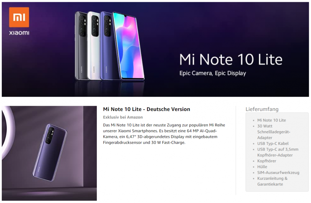 Bei amazon.it oder amazon.es kann man sich derzeit das Xiaomi Mi Note 10 Lite zum Preis von 335 Franken vorbestellen. Laut toppreise starten die Preise in der Schweiz ab ca. 389 Franken. Alternativ kann man sich für ca. 20 Franken mehr das Smartphone auch von amazon.de bestellen, da gibts ein Paar kabelgebundene Kopfhörer gratis dazu (man sollte aber eher wegen dem deutschen Support bestellen, die Kopfhörer werden den Aufpreis nicht wert sein).