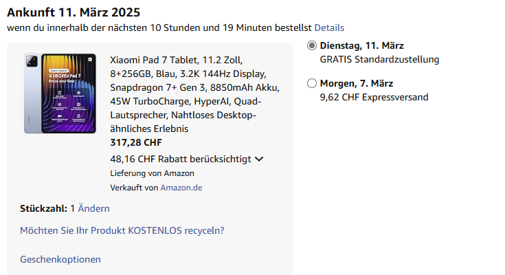 Das Pad 7 (256GB, 8GB RAM) gibt es mit einem 50 Euro Gutschein für unter 320.- CHF und für 50.- CHF mehr bekommt man das Pad 7 Pro.