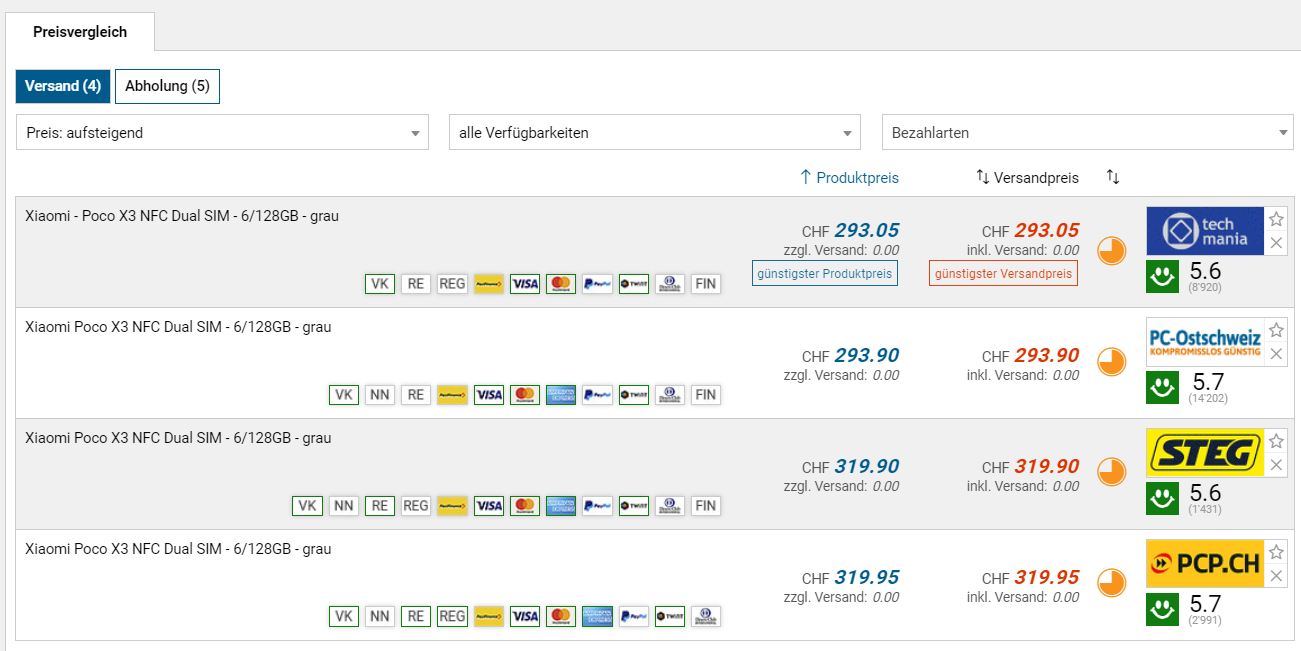 Bei Amazon kann man sich derzeit das Smartphone Poco X3 NFC in der 6/64 oder 6/128GB Ausführung zum Vorbestellpreis von 193 resp. 238 Franken in die Schweiz bestellen. Laut toppreise verlangt der günstigste Schweizer Anbieter derzeit knapp 255 resp. 293 Franken.