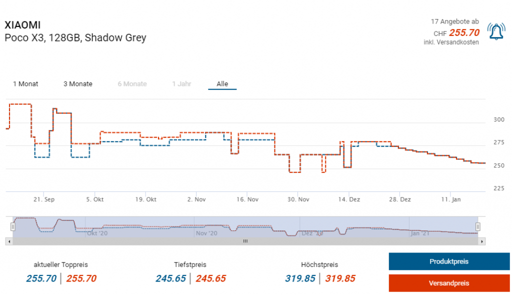 Bei Amazon gibts derzeit das Android-Smartphone Poco X3 NFC in der 6/128GB Speicherkonfiguration zum Bestpreis von 215 Franken. Laut toppreise starten die Preise in der Schweiz bei etwa 255 Franken.