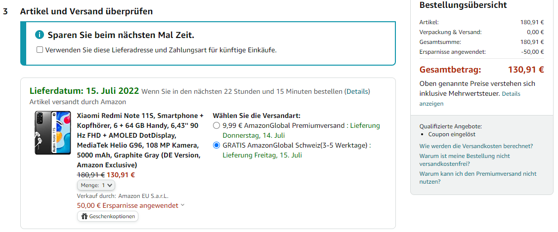 Bei Amazon gibt’s dank eines 50€-Coupons (wird an der Kasse abgezogen) das Redmi Note 11s zum absoluten Bestpreis von 130,91€ (=130 CHF). Zu diesem Preis ein No-Brainer. Aktionspreis gilt für die blaue und die graue Version.