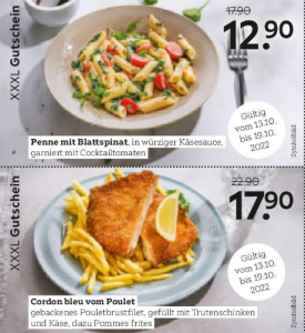 Falls ihr während dem Shoppen noch was essen möchtet, findet ihr im Prospekt ebenfalls Gutscheine für das Restaurant zum Beispiel für Penne mit Blattspinat in würziger Käsesauce für CHF 12.90 oder Cordon bleu vom Poulet mit Pommes CHF 17.90. 🤩