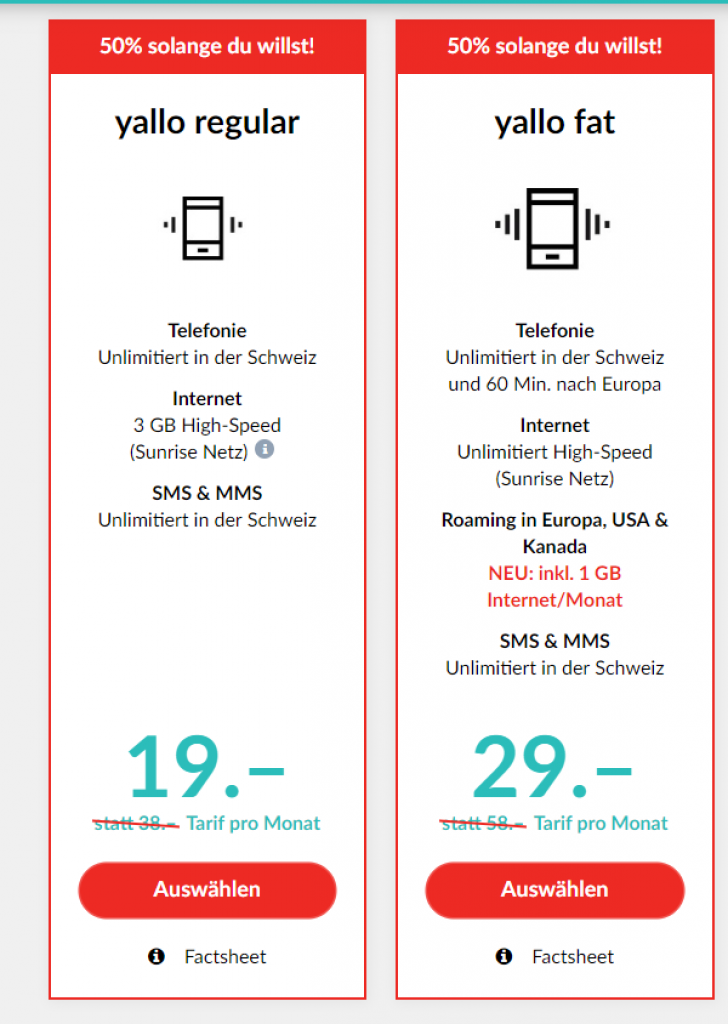 Derzeit gibt’s bei yallo wieder eine interessante Aktion. Und zwar gibt’s das yallo fat Abo für CHF 29.- Speziell ist jedoch, dass statt nur 200MB neu 1GB Roaming-Daten pro Monat inkludiert sind. Wer also öfters in Europa, USA oder Kanada ist, könnte das ein super Deal sein. In der Schweiz ist unlimitiert Telefonie, 4G und SMS/MMS inkludiert. Zudem 60 Minuten Telefonie nach Europa pro Monat.