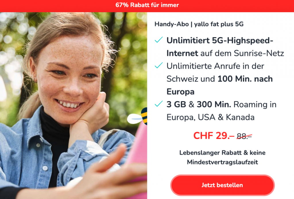 Bei yallo gibt es wieder das Yallo Fat Plus 5G Abonnement in Aktion – diesmal zum Preis von CHF 29.- pro Monat. Der Rabatt gilt lebenslang. Das Angebot ist vor allem interessant für Leute, die sich oft im Ausland befinden.