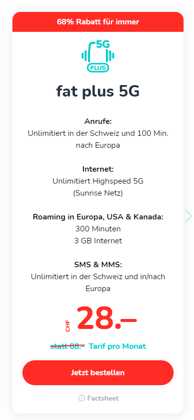 Yallo Fat Plus 5G (Sunrise-Netz, CH alles unlim. + 5G, 100 min. nach EU, 300 min. + 3GB in EU, US&CA) für CHF 28.- / Mt.