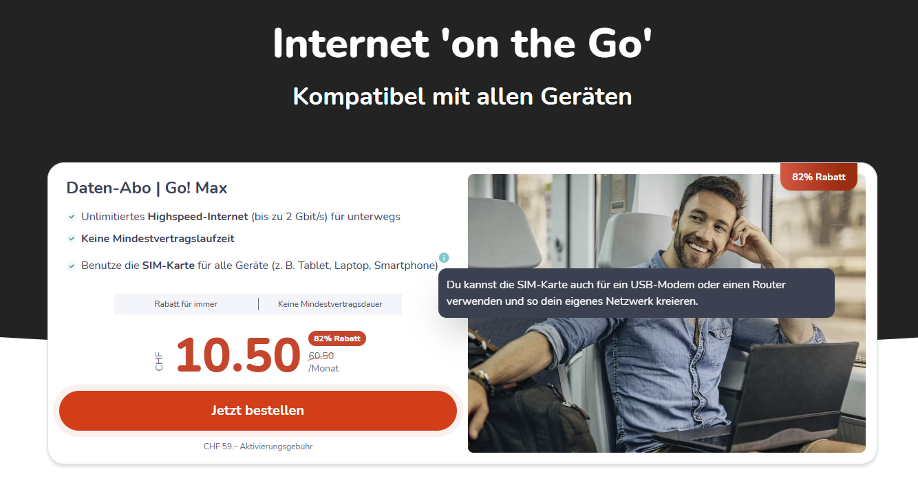 Vor Kurzem gab es noch das Yallo Go! Max für 15.90 Franken pro Monat, hier noch der Deal dazu. Jetzt ist der Preis um 1.– Franken gesunken, und zwar könnt ihr euch das Daten-Abo für nur 14.90 Franken pro Monat ergattern. Jetzt gibt es dieses Abo aktuell für nur 10.50 Franken pro Monat. Jedoch fallen noch Aktivierungskosten von 59.– Franken an, die beim vorherigen Deal nicht angefallen sind.