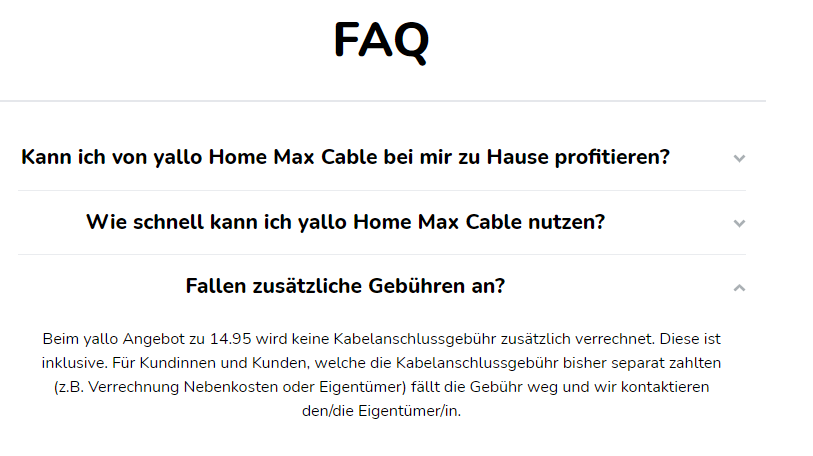 Der freundliche Telekom Experte für moneyland.ch meint: Kabelanschluss Gebühren seien inklusive (Quelle). Schätze da herrscht aktuell noch grosse unsicherheit. Ich freue mich auf die Abklärung von @CrAnkLegend. Vielleicht gibt es ja in ein par Stunden auch noch einen FAQ-Eintrag bei Yallo. Vorher vertraue ich keiner Information, solange diese so unterschiedlich ausfallen.