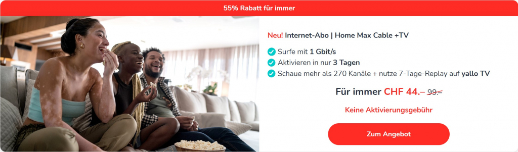 Bei Yallo gibt es das Internet-Abo Home Max Cable +TV zum Preis von CHF 44.- anstatt CHF 99.-.