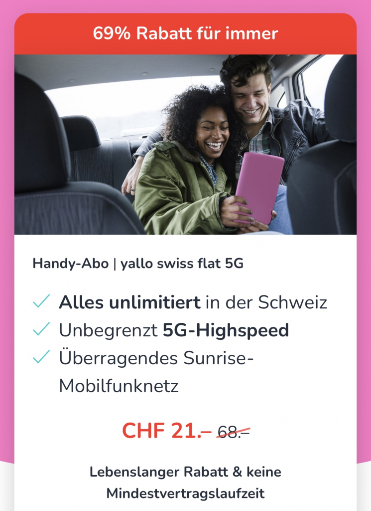 Zum Valentinstag bietet yallo wieder eine stark vergünstigte Mobil-Flat inkl. 5G (nur CH) für nur CHF 21.- an, wie üblich „lebenslang“ und ohne Mindestvertragszeit. Allerdings mit einer Aktivierungsgebühr von CHF 59.-…