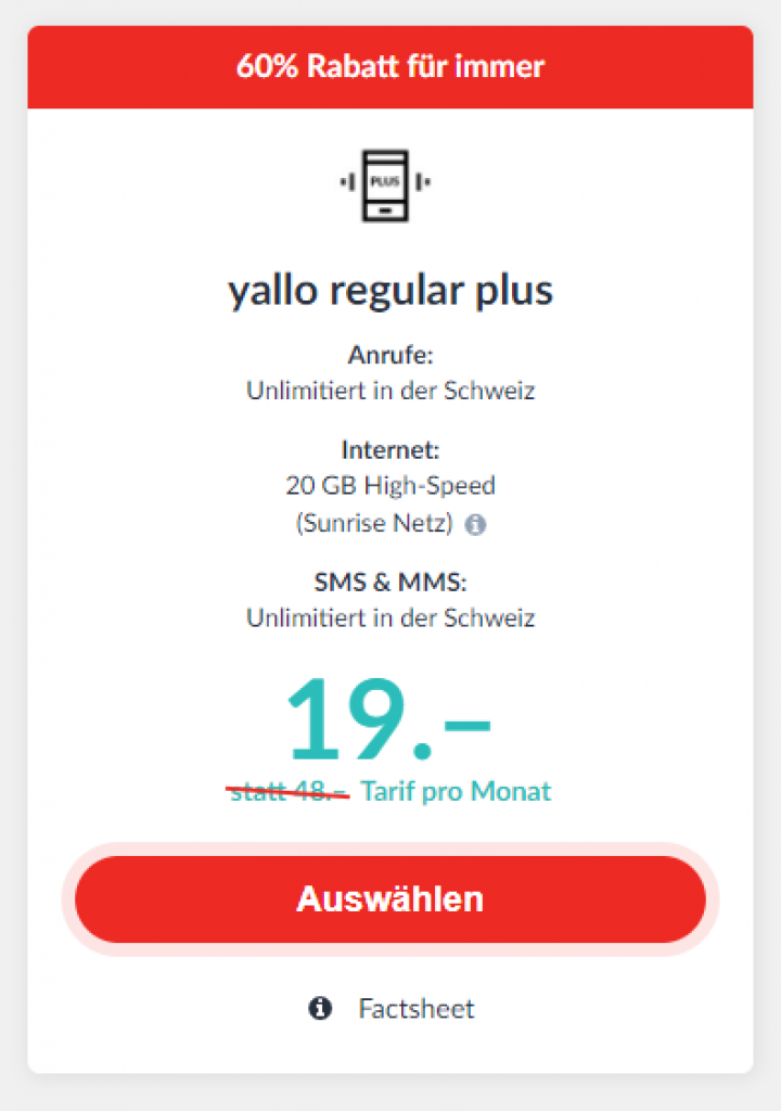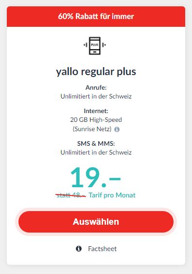 Beschreibung von Yallo: Unlimitierte Anrufe, SMS & MMS in alle Schweizer Netze. Unlimitiertes Datenvolumen inklusive 20 GB High-Speed 4G Internet (max. 100 Mbit/s) für mobiles Surfen. Nach Verbrauch des inkludierten 4G High-Speed Internets surfst du mit der Dayspeed Option für CHF 1.20/Tag weiter mit 4G High-Speed oder wahlweise kostenlos mit reduzierter Geschwindigkeit (256 kbit/s).