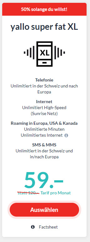 Yallo super fat XL 50% = 59 CHF - ALLES unlimitiert in CH, EU, USA, CA