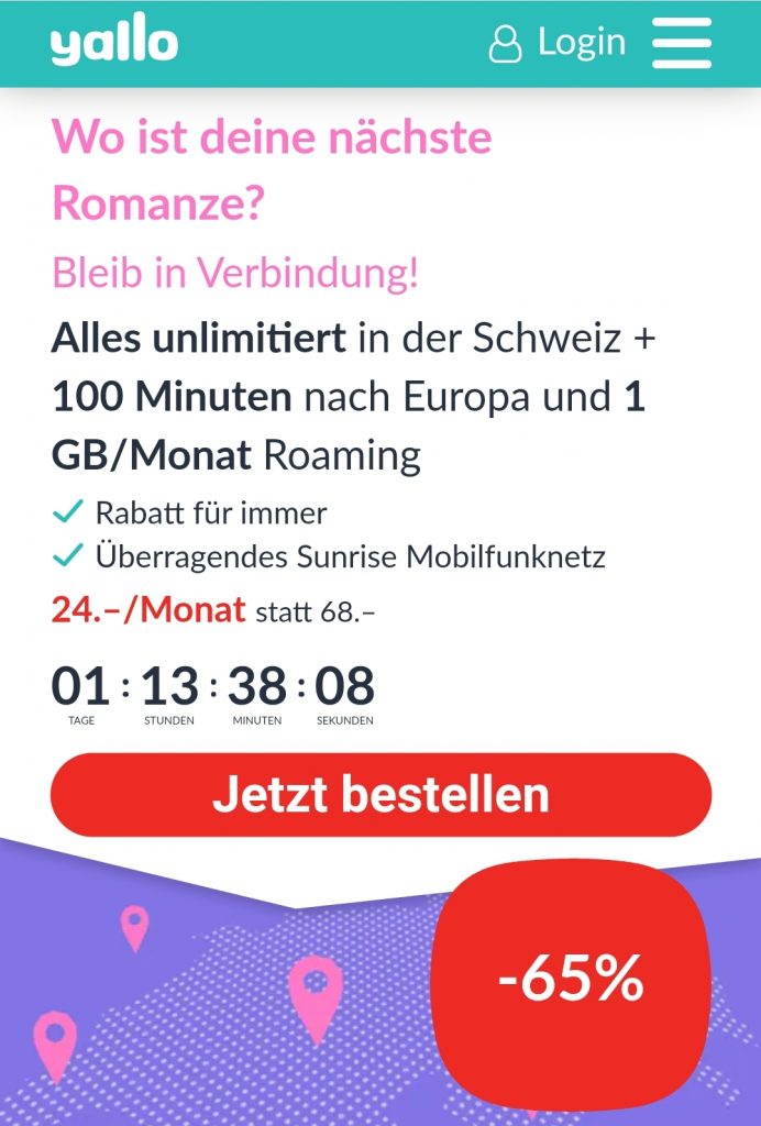 Für 24.- im Monat kriegt Ihr schweizweit alles unlimitiert und fürs Roaming habt Ihr 1 GB Daten, sowie 100min Telefonie zu gut.