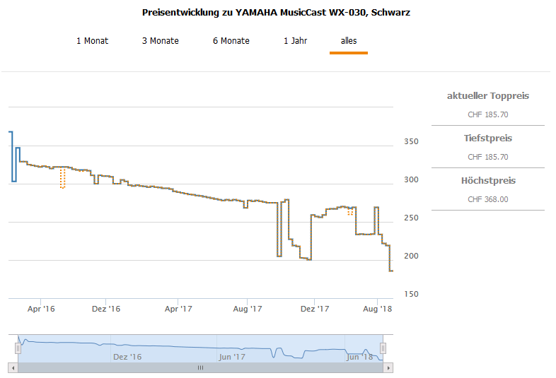 Gemäss toppreise gab es den Lautsprecher noch nie günstiger als für 200.40 CHF, der zweitbeste Preis liegt aktuell bei 219.- CHF.