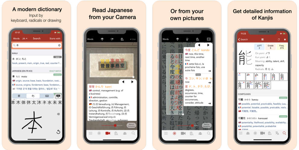 • Search definitions in any kind of alphabet: Kanjis / Hiraganas / Katakanas / Romajis.