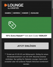 15% Extra-Rabatt bei Zalando Lounge ab 50.- Mindestbestellwert. Kann bis zu 3x pro Kunde eingelöst werden und ist bis am 31.03.2023 gültig.