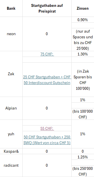 Dieser Vergleich bezieht sich aber nur auf Startguthaben und Zinsen. Schaut man Wechselgebühren an oder man möchte Aktienhandeln dann hat wahrscheinlich eine yuh oder neon die Nase klar vorne. Dazu mache ich vielleicht auch mal einen Vergleich.