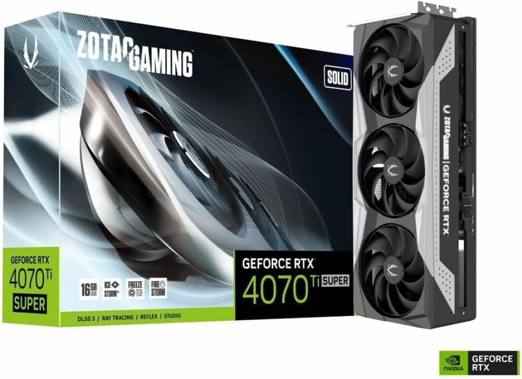 Die Zotac Gaming GeForce RTX 4070 Ti Super Solid OC 16 GB GDDR6X verfügt über eine modernste NVIDIA Ada Lovelace-Architektur, die Spielern Funktionen wie DLSS 3.5 und Echtzeit-Raytracing sowie Funktionen bietet, die sich auf niedrigere Temperaturen und verbesserte Haltbarkeit konzentrieren. Mit grösseren Lüftern und einem stabileren Rahmen ist die SOLID eine gute Wahl für Gamer, die Wert auf Funktion als Form legen.