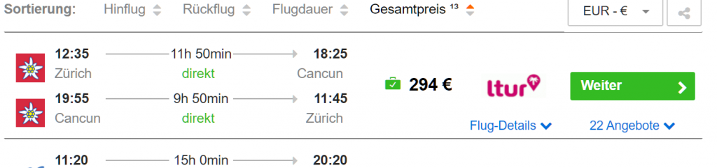 Bei L’Tur gibt’s derzeit für diesen Dezember Flüge von Zürich nach Cancun für unter 300 EUR. Der Flug ist Nonstop, das Gepäck ist bereits inklusive.