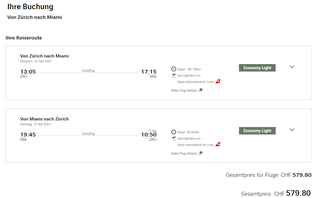 Swiss hat wohl meinen Kommentar gelesen 😄 jetzt schon für rund 430.- https://www.skyscanner.no/transport/flights/zrh/mia/231109/231121/?adults=1&adultsv2=1&cabinclass=economy&children=0&childrenv2=¤cy=EUR&destinationentityid=27537542&inboundaltsenabled=false&infants=0&locale=en-GB&market=CH&originentityid=27539902&outboundaltsenabled=false