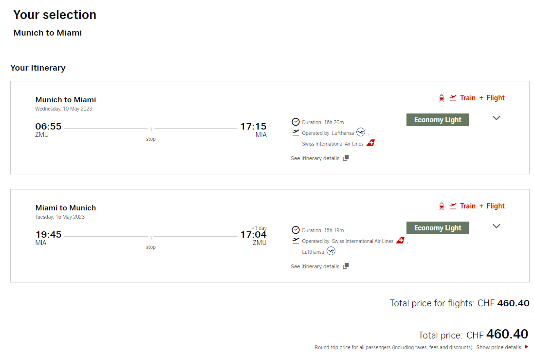 Und wenn Sie es von München aus kaufen, sinkt der Preis auf 460 CHF. Der Teil München-Zürich ist ein Zug, also können Sie ihn einfach überspringen - niemand kann überprüfen, ob Sie tatsächlich den Zug genommen haben. Oder Sie können in Winterthur oder St. Gallen zusteigen und haben einen kostenlosen Flughafentransfer.