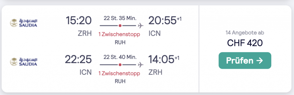 Aktuell könnt ihr Flüge von Zürich nach Seoul buchen ab CHF 420.- hin und zurück inklusive 23kg Aufgabegepäck. Hier ein Beispiel mit Hinflug am Freitag, 06.10. und Rückflug am Di, 24.10. mit einem Zwischenhalt von ca. 5h in Riad.
