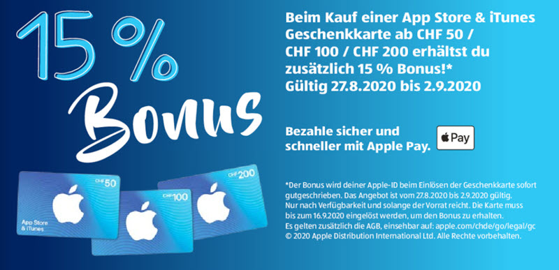 Beim Kauf einer App Store & iTunes Geschenkkarte ab CHF 50 / CHF 100 / CHF 200 in einer Aldi Filiale gibt es ab dem 27.8.2020 zusätzlich 15% Bonus. Der Bonusbetrag wird deiner Apple-ID beim Einlösen der Geschenkkarte sofort gutgeschrieben. Die Karte muss bis zum 16.9.2020 eingelöst werden, um den Bonus zu erhalten.