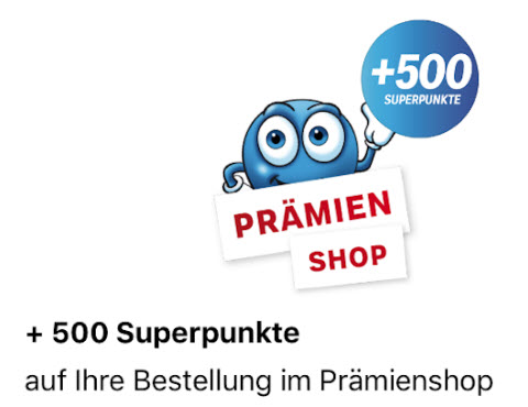 Gültig für Prämienbestellungen ab 2’000 Superpunkte (exkl. Ticketshop). Nur einmal einlösbar. Die Gutschrift der Superpunkte erfolgt bis spätestens 7 Tage nach Bestellung.