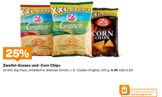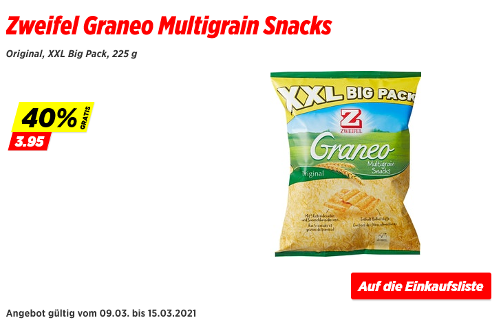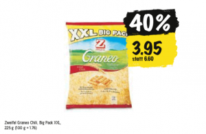 Nachdem unser geschätzter Bierbaron den langersehnten Bier-Deal gepostet hat, braucht es wieder einen entsprechenden (salzigen) Snack dazu. Diese Woche habe ich wieder in die Chips-Tüte gefriffen. Bei Denner sind die XXL-Packungen (225g) von Zweifel Graneo „normal“ und „Chili“ für CHF 3.95 in Aktion.