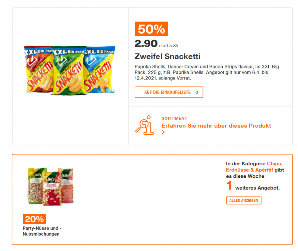 Wurde bereits von bluefox in seiner tollen Snackübersicht gehighlighted, jedoch ging dieser eventuell etwas unter und soll auch als Erinnerung dienen, da nur noch morgen gültig: Aktuell kriegt man 50% auf die grossen Snacketti Packungen sowie 20% auf die Party-Nüsse. Diese Dinger machen absolut süchtig und sind mit Vorsicht zu geniessen 😀 Wer direkt per Migros Online bestellen möchte, kann dazu noch diese Gutscheine gleich einlösen und doppelt profitieren!