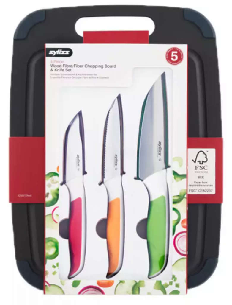 - Holzfaser-Schneidebrett und 3-teiliges Messerset